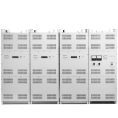 Трехфазный стабилизатор напряжения состоит из четырех блоков. Три из них — это блоки стабилизации фазы, и один — коммутационный блок. Устанавливать стабилизатор можно на полу, а можно отдельные блоки подвесить на стену. Этому способствует удобный металлический корпус каждого блока. Ключевые узлы, отвечающие за работу и выполнение стабилизатором своих обязанностей, находятся на шасси, которое прикрывается днищем и передней панелью корпуса.